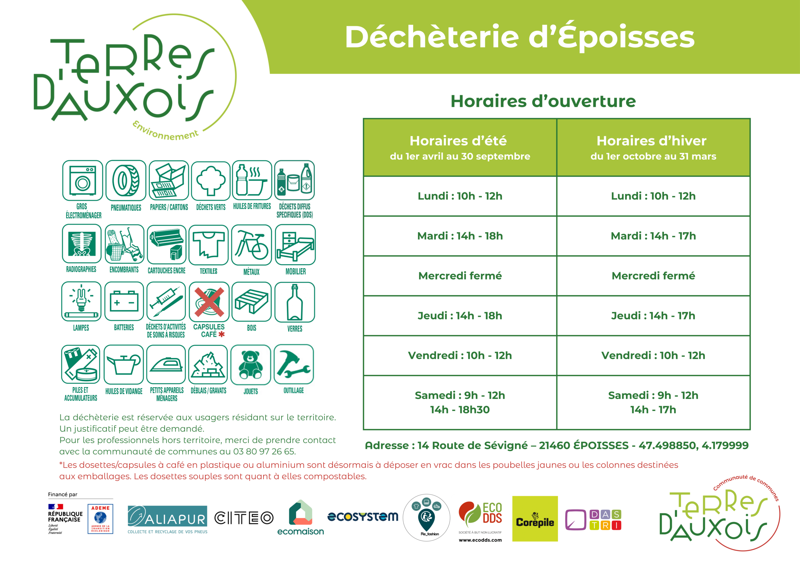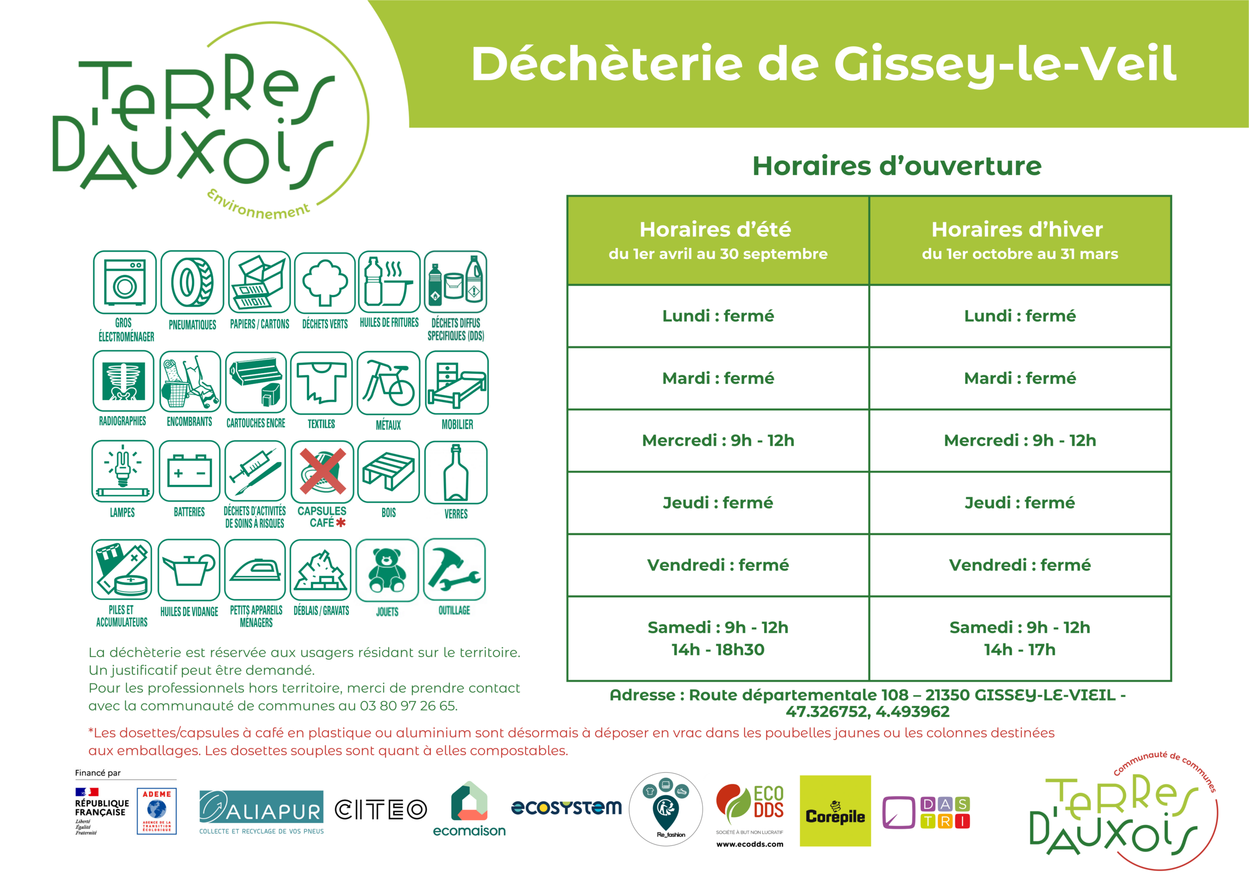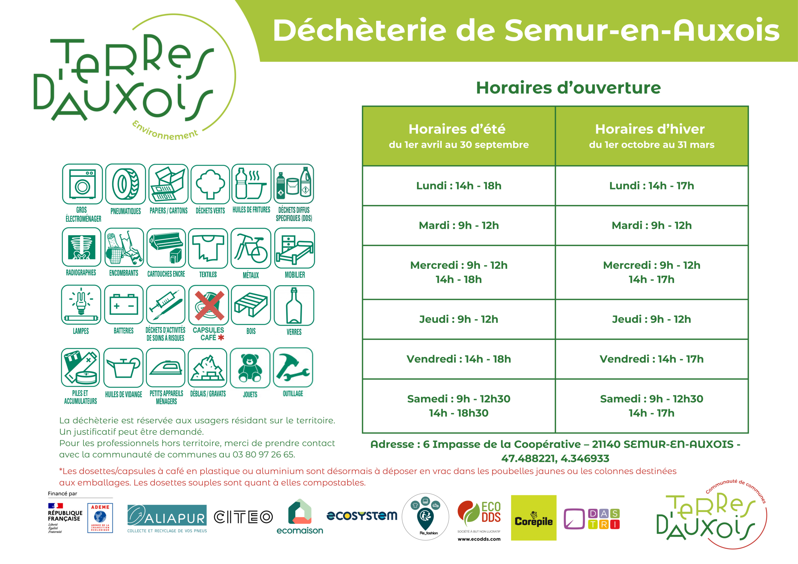 La Communauté de communes gère cinq déchèteries sur le territoire à Vitteaux, Semur-en-Auxois, Epoisses, Gissey-le-Vieil et Nan-sous-Thil. Consultez ci-dessous les horaires d’ouverture par site et par jour.