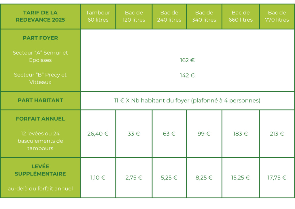 Votre redevance est calculée en fonction de votre lieu d’habitation. Deux secteurs existent au sein du territoire, le secteur “A” (Semur-en-Auxois, Epoisses et leurs alentours) et le secteur “B” (Précy-sous-Thil, Vitteaux et leurs alentours). Les habitants du secteur “A” disposent d’un bac jaune, les habitants du secteur “B” apportent leurs emballages recyclables dans les colonnes d’apport volontaire (PAV).